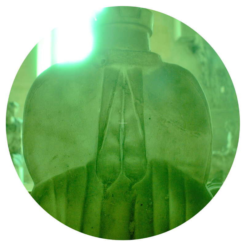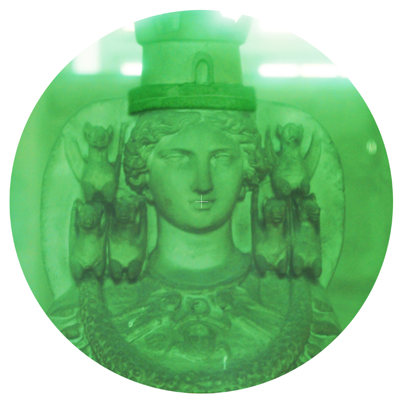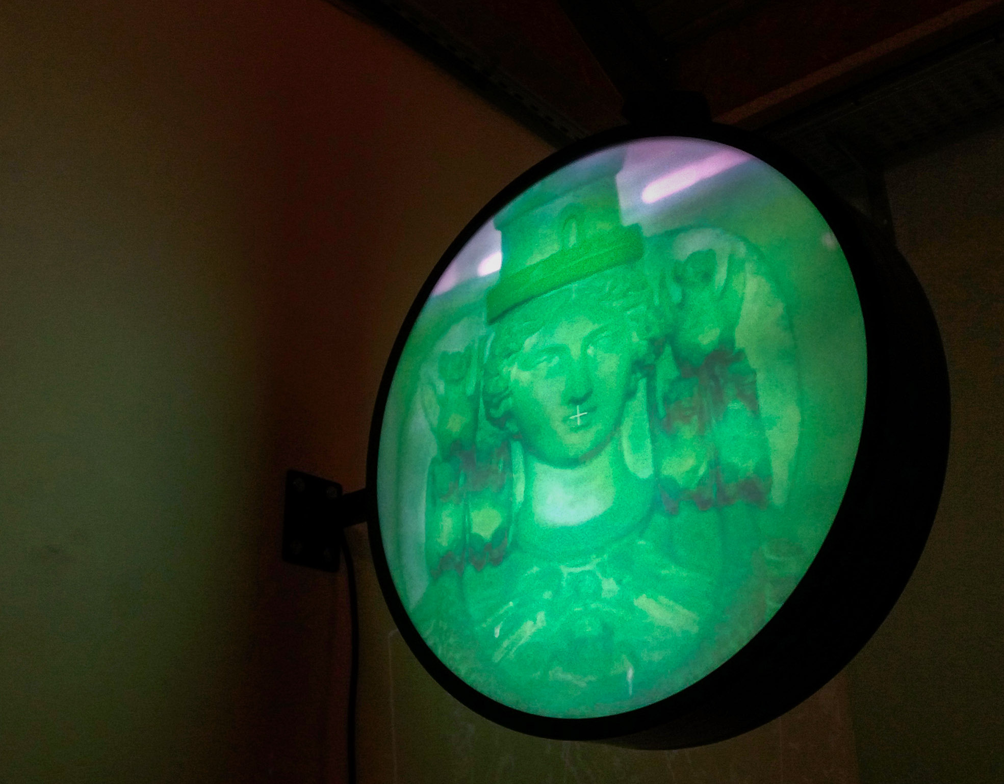 « Artémis », 2018. Enseigne lumineuse laquée, 90 cm de diamètre. Cette enseigne lumineuse présente en recto verso la figure d’Artémis, dans une couleur verdâtre qui rappelle la perception des jumelles nocturnes. A la place des animaux existants invisibles la nuit, il s’agit de matérialiser la vision fantasmée de la déesse qui les incarne.