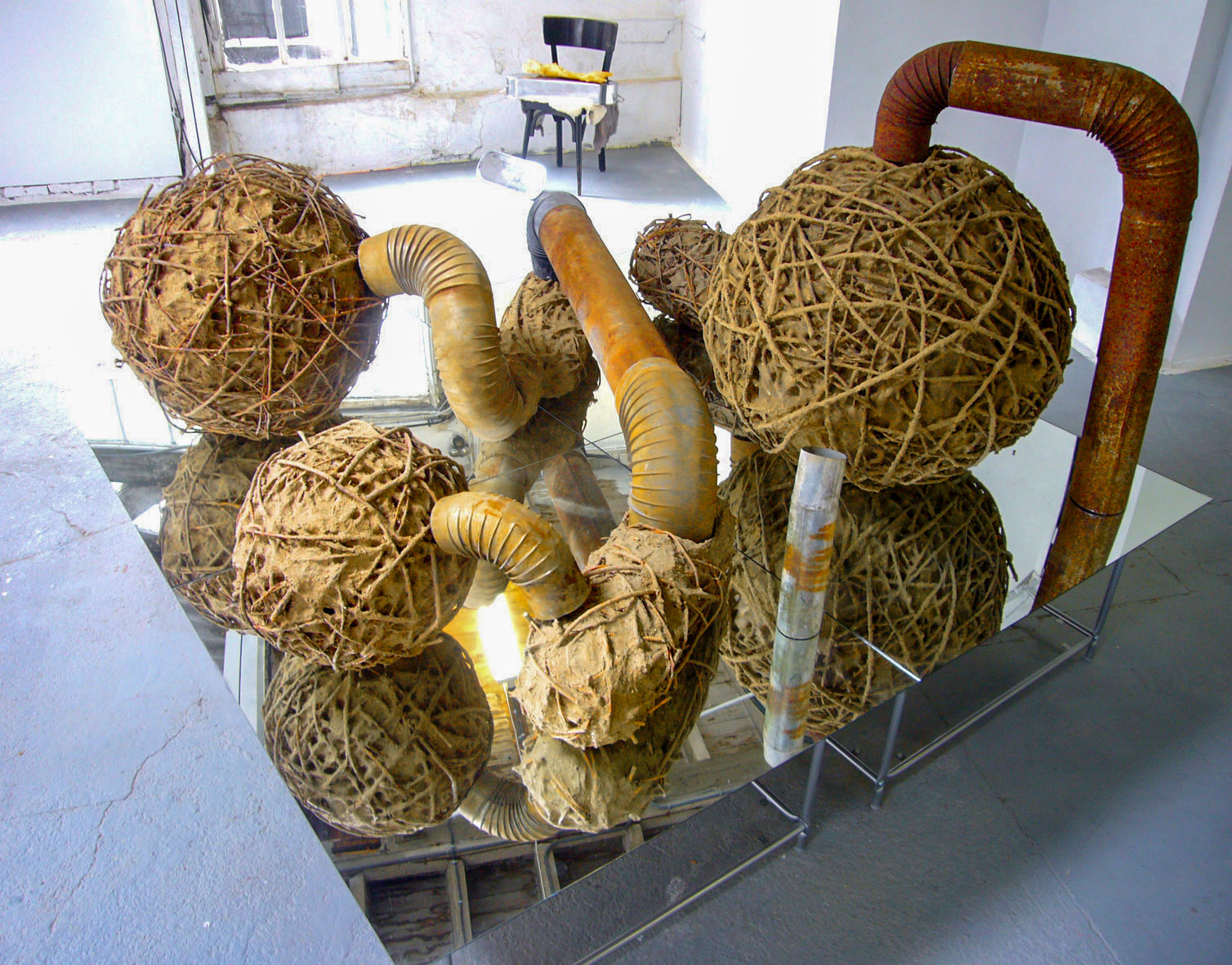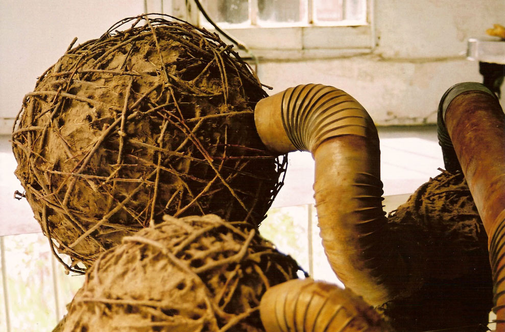 « Le Terrier« , 2007, Installation sonore, 2 m x 2 m x 1,30 m, Torchis, osiers, tuyaux, miroirs, bande-son, Exposition Matière première, Orléans 2007. Cette installation sonore, constituée d’éléments en osier et torchis posés sur des miroirs, établit un lien structurel entre le corps organique et l’habitat animal. Un bruit de grattage doublé de vocalises vaporeuses émane de l’œuvre. Cette installation renverse le rapport entre le plein et le vide : le creux devient volume et le trou n’est plus creusé mais façonné.