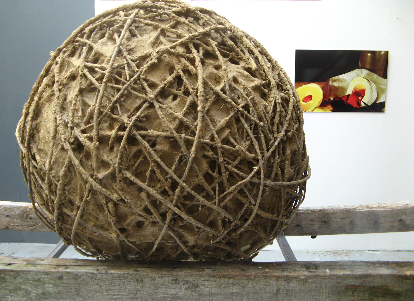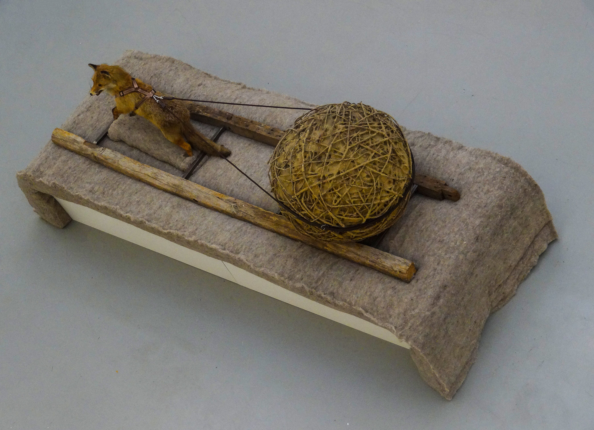 « Sisyphe Goupil« , 2013, 300 x 100 x 130 cm, Renard naturalisé, rênes, harnais, osier et torchis, poutres, métal, laine, bois. Galerie Commune (Tourcoing), Centre d’art Scène nationale d’Orléans. Un renard empaillé harnaché tire une boule en osier et torchis, tel un voyageur traînant avant lui son habitat. Entre le mythe de Sisyphe et la fable, l’œuvre questionne de manière décalée la condition animale mais aussi humaine, celle de devoir accomplir un éternel effort, de continuer à avancer malgré le poids de l’existence.